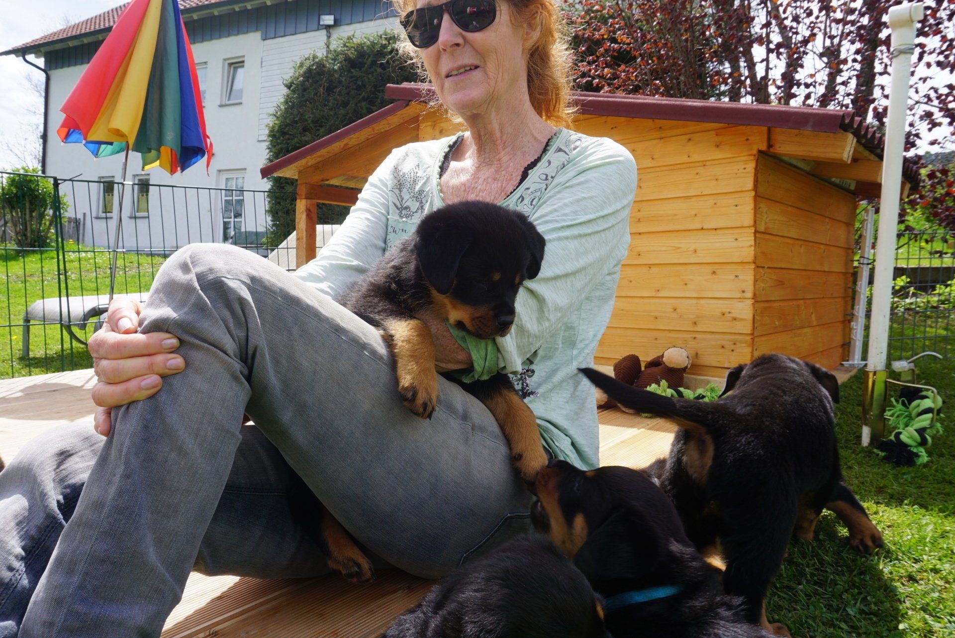 ...ist die "Mutter" all unserer Welpen. Sie pflegt und hegt Ihre Schützlinge und hat bei der Auswahl unserer Hunde immer einen guten 7. Sinn. Sie führte Deyla in FH bis zur Deutschen Meisterschaft und Obelix in VPG. Derzeit betreut und führt sie Baghira vom Bamberger Tal. Inge ist für die Auswahl der Welpenkäufer verantwortlich. Auch da hat sie das nötige Bauchgefühl und gute Menschenkenntnisse um beurteilen zu können, wer fähig ist, verantwortlich mit einem Tier, in diesem Fall, einem Rottweiler, umzugehen. Dies ist für uns das alle das Wichtigste.