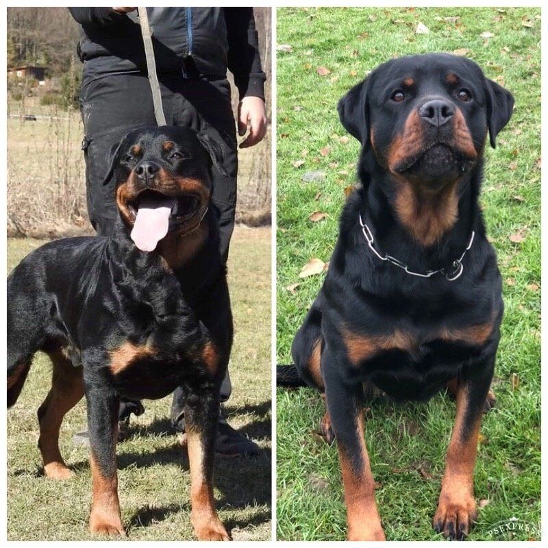 Der Rottweiler ist ein kraftstrotzender, wendiger und ausdauernder Gebrauchshund. Er hat einen breiten Schädel mit markantem Stirnabsatz aus ausgepägtem Jochbogen. Sein kräftiger Hals ist gut bemuskelt.